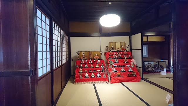こちらは、公開している商家の勝川家、靴を脱いで上がらせてもらうこともできます。今回は、外から覗くだけです。ひな祭りがまだきれいに飾ってありました。昔ながらのひな飾りが、たくさんありました。